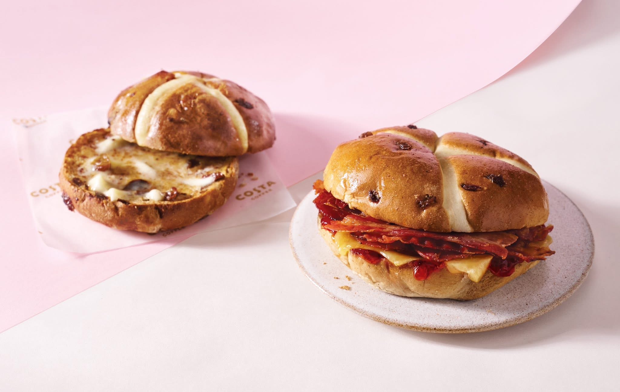 Highlights include the Sweet Ube Hot Chocolate and Sweet Ube Frappe, alongside the refreshing Cherry Vanilla Iced Matcha Latte. On the food side, try the Bacon, Mature Cheddar & Chilli Jam Hot Cross Bun, the Strawberry & Matcha Cookie Sandwich, a Chicken Salad Sandwich, or a classic Hot Cross Bun.