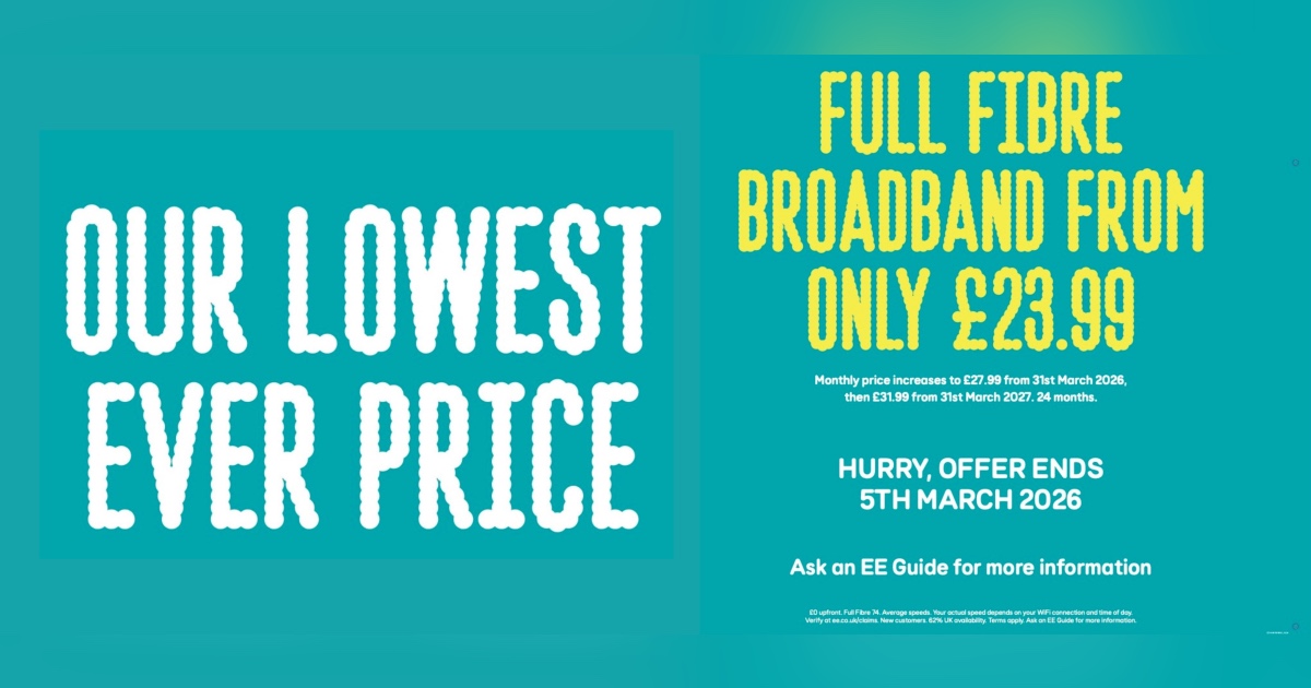 EE is currently offering its lowest ever price on Full Fibre Broadband, with packages available from just £23.99 per month – making lightning-fast speeds more affordable than ever.