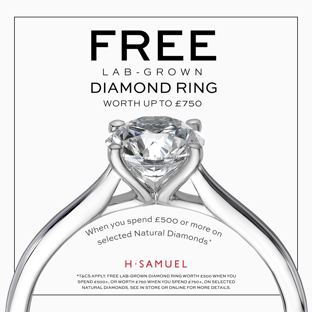 If you’re after a little more sparkle, spend £750 or more on selected natural diamonds and get a free 1ct lab-grown diamond ring worth £750.